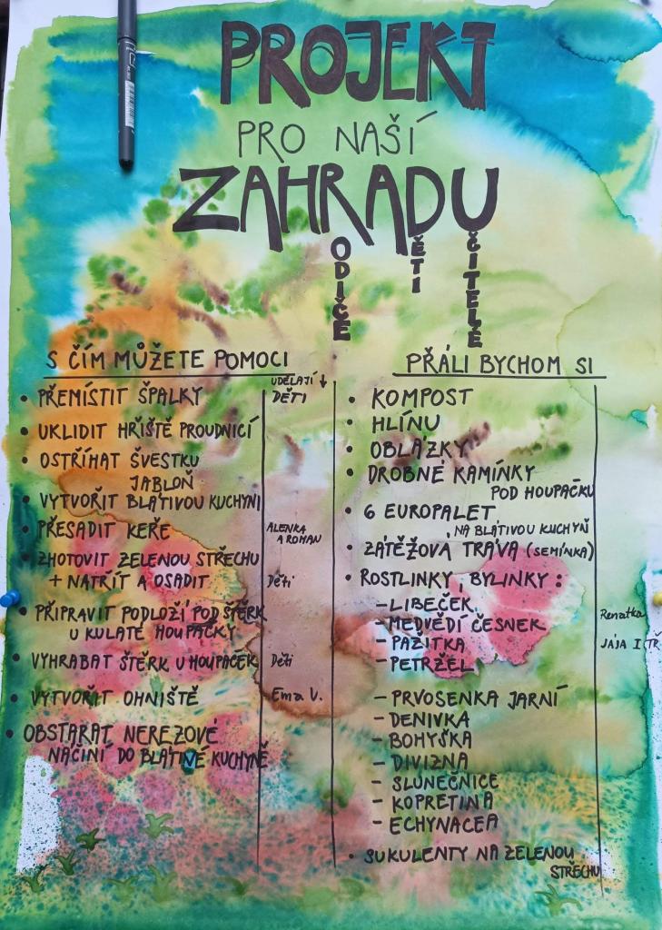 Možná jste si všimli plakátu na vstupních dveří do školy. Chtěli bychom postupně zvelebovat naši školní zahradu a to společně s dětmi a rodiči. Máme určitou představu a nápady. S čím a jak byste mohli pomoci najdete právě na plakátu. V případě zájmu o některou činnost nebo dodání materiálu, rostlin atd., se můžete zapisovat na plakát. Na další dotazy Vám odpoví pí. vychovatelka Alena Hájková, která má projekt na starosti.